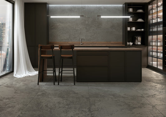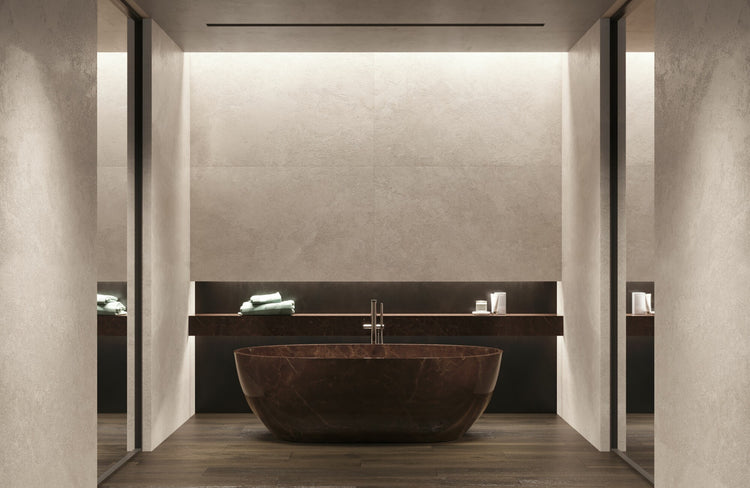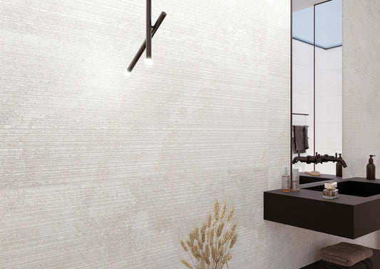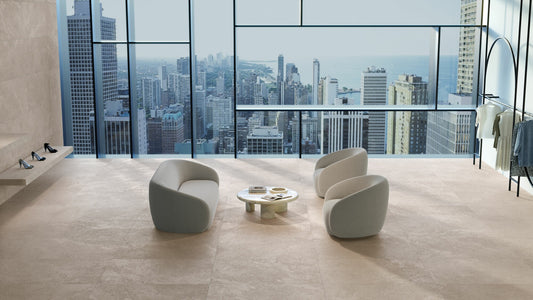 The Chicago collection features a restful looking stone pattern with a nebulous appearance, where one shade merges into the next, lending it a chic modern appearance. It comes in a choice of four natural looking shades (Cloud, Dune, Mocha and Moon) in a wide variety of formats (100x260cm, 100x180cm, 100x100cm, 60x120cm and 90x90cm) and a Shaped, Natural or Antislip finish. The collection also features a 50x150cm model, made with brand new 4D WALL technology, conceived to bring an added natural appeal to living spaces, thanks to its size and unparalleled Shaped finish. It is also expanded with the 33.3x100cm wall tile format and its deeptech decoration, in the three light colors: cloud, road and mocha.
