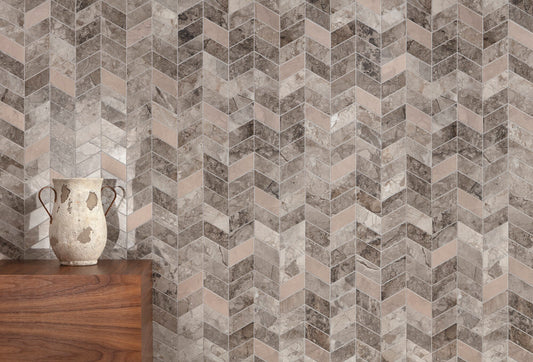 Muse is a collection that conjures up images of the home of your dreams. It can be used in a wide variety of applications, with a personal twist as unique as each individual dream. The collection’s design is inspired by Illusion Bronze marble, further enhanced by clusters of stone, which lend its rich veined pattern a fascinating depth. Muse comes in two pale shades —Cloud, in a colder shade, and Desert, in a warmer one— and two darker colours with more shade variation —Dune, in warm grey shades, and Mocha, in dark brown ones—. The collection is available in a 100x180 cm, 100x100 cm, 75,5x151 cm, 60x120 cm or 33,3x100 cm format in a choice of a Premium Polished, Shaped, Polished or Anti-Slip finish.